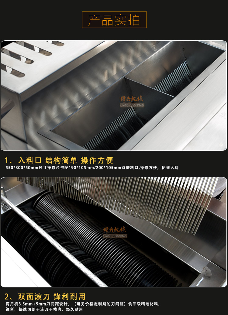 贛云2017款大型切肉機(jī),工程款切肉片肉絲機(jī),采用1.2mm304不銹鋼板材加工設(shè)計(jì),配備3kw大功率純銅電機(jī),380v工業(yè)用電,使得產(chǎn)品性能穩(wěn)定,雙滾切刀設(shè)計(jì),切肉效率高,雙規(guī)格切肉刀具組合,適合大眾需求。