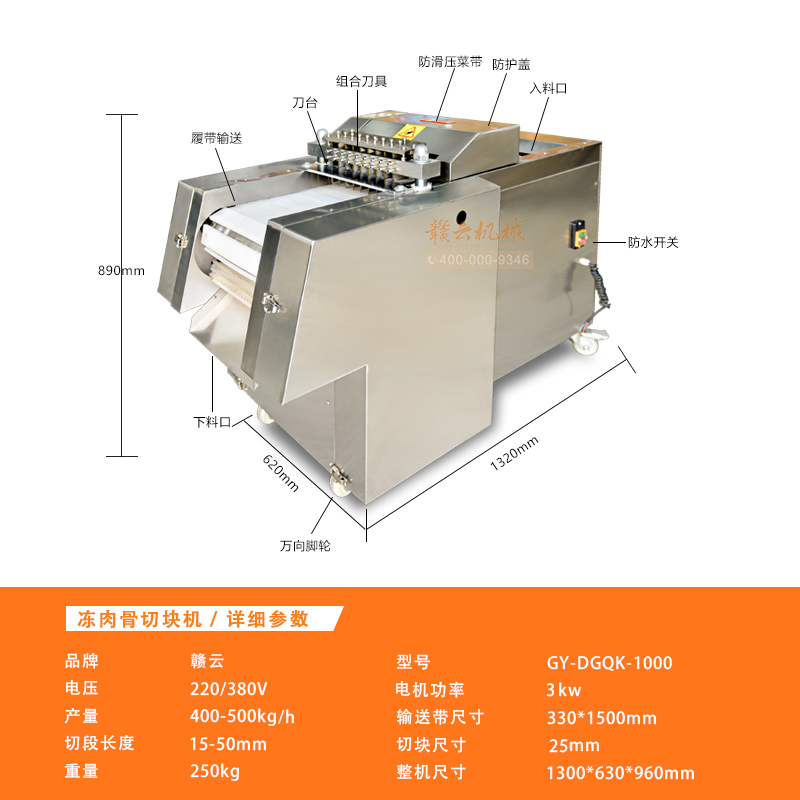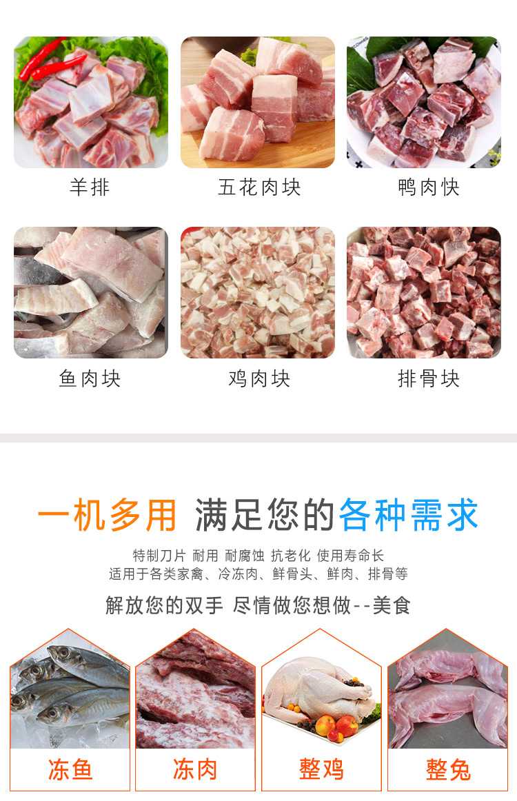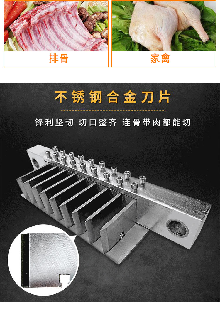 適用于雞、鴨肉、中小型動物骨頭、排骨、冷凍肉、鮮肉、凍雞、雞腿等加工設備,可根據需要剁塊、段、條等形狀大小可調。本機性價比高,節(jié)省人工,一機可抵多個人工作,每小時可剁切1000公斤,大大提高生產效率。廣泛用于大中小型食品加工廠、集體食堂、屠宰場、肉聯(lián)加工廠、超市、飯店等地使用。