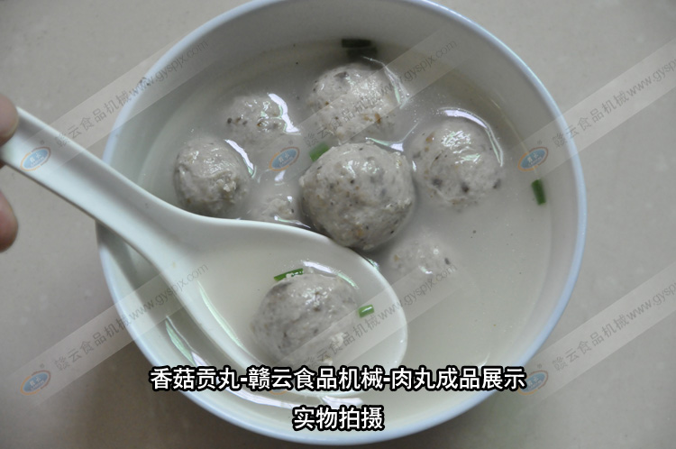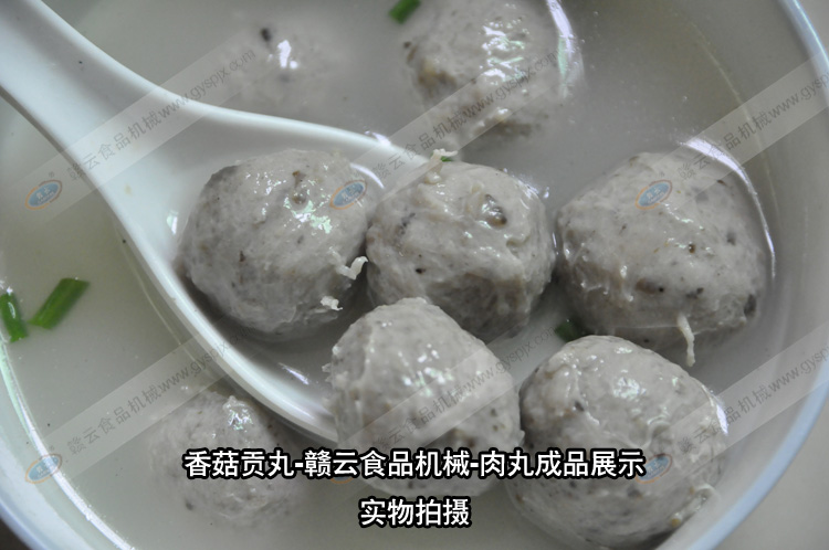 贛云食品機(jī)械肉丸成套設(shè)備的結(jié)晶,香菇貢丸,合作客戶獨(dú)家配方,用贛云牌肉丸設(shè)備制作的香菇貢丸,味美,有嚼勁,香菇原味,保證您吃了還想吃。香菇貢丸所需設(shè)備:自動(dòng)絞肉機(jī)一臺(tái),高速打漿機(jī)一臺(tái),慢速打漿機(jī)一臺(tái),食物切碎機(jī)一臺(tái),貢丸機(jī)一臺(tái),自動(dòng)煮丸水槽一臺(tái)即可現(xiàn)做現(xiàn)賣,也可接單定做。相關(guān)設(shè)備的工作內(nèi)容:自動(dòng)絞肉機(jī)碎肉,高速打漿機(jī)將肉?焖俅虺扇鉂{,慢速打漿機(jī)將肉漿調(diào)味,食物切碎機(jī)將香菇切成細(xì)小顆粒,放入慢速漿機(jī)中和肉漿一起調(diào)勻入味,貢丸機(jī)將肉漿成型貢丸,自動(dòng)煮丸水槽將成型后的肉丸初步定型。批量的香菇貢丸就是這樣制作而成。